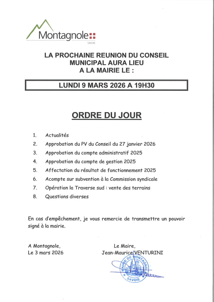 Le prochain conseil municipal aura lieu le lundi 9 mars 2026 à 19h30 salle du Conseil municipal