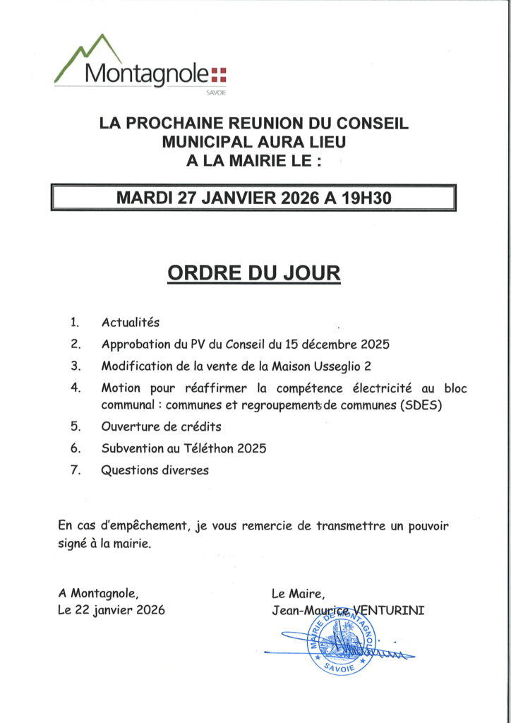 Le prochain conseil municipal aura lieu le mardi 27 janvier 2026 à 19h30 salle du Conseil municipal